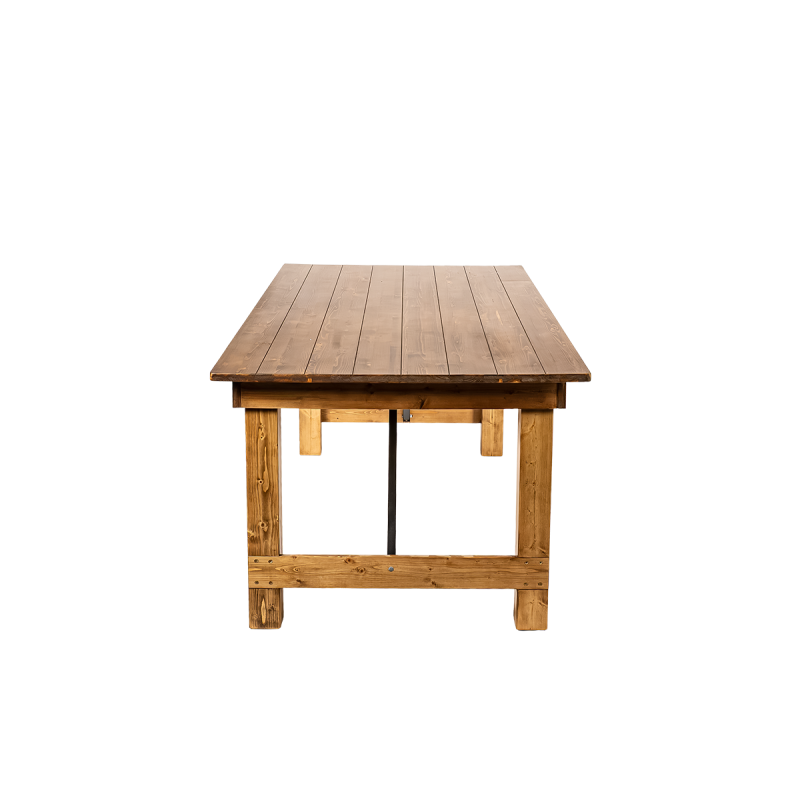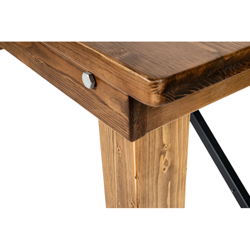 Prirodzená štruktúra borovice zvýrazňuje jedinečný pôvab stola a vnáša do interiéru teplo a útulnosť. Precízne spracované detaily a viditeľná kresba dreva mu dodávajú autentický, vidiecky vzhľad. Kovové výstuhy zvyšujú stabilitu konštrukcie a zaručujú bezpečné a spoľahlivé používanie aj počas veľkých podujatí.